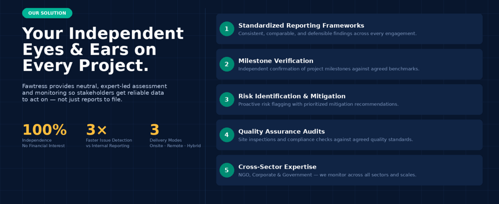 Fawtress provides neutral, evidence-based project assessment, monitoring, and verification services. We deliver reliable, data-driven insights that empower stakeholders to make informed decisions grounded in facts. Our focus on accuracy and objectivity ensures clients can act confidently with solid evidence to support their strategies.