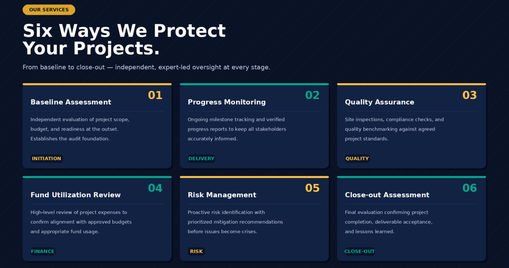Our Independent project assessment and monitoring services is designed to ensure transparency, accountability, and delivery confidence across projects of all sizes.