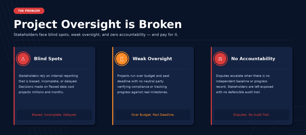 We are the impartial eyes your project needs, ensuring verification of scope, quality, budget, and timeline at every phase, so you’re always informed of the truth.